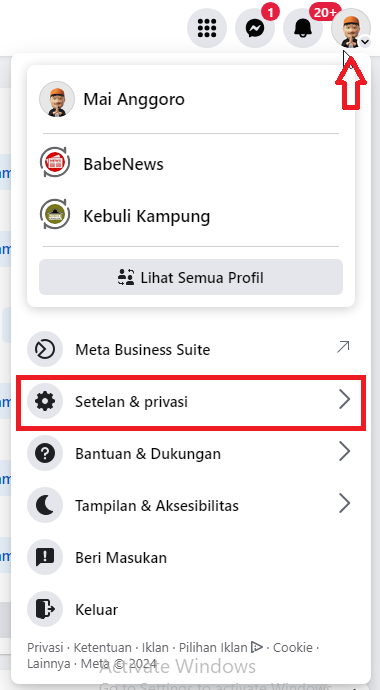 - Klik lagi profile di pojok kanan atas, pilih Setelan & Privasi, pilih Pengaturan